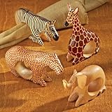 Men and women of Kenya's Kamba tribe carve these safari animal napkin rings using hard olive wood. These workers are known as jua kali, a phrase that means hot sun but has come to mean those who earn a living in woodworking or metal carving. Each set contains a zebra, giraffe, elephant, and leopard. Please allow for small variations in each handmade carving.