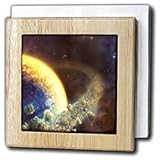 Spacerock VIII - space scene with ring around the planet Tile Napkin Holder is measuring 6w x 6h x 4d. Made from high quality solid maple wood with satin finish and two 4.25 commercial grade mirror gloss ceramic tiles. Holds napkins, mail, letters or files. In addition, customized engraving, on the face of the item, is available on request.